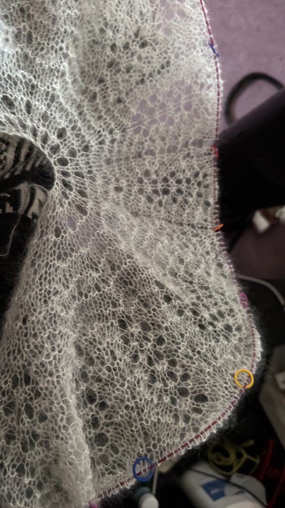 During the winter months, many brides ask what they can wear over their gowns without compromising the elegance of their look. This hand-knitted wrap was created with a bride in mind, who fell in love with it while it was still in progress. Working from a pattern by Kristin Omdahl, I refined the design for her wedding by adding Swarovski crystal droplets along the hem, along with delicate bicone beading to introduce a subtle, light-catching shimmer.