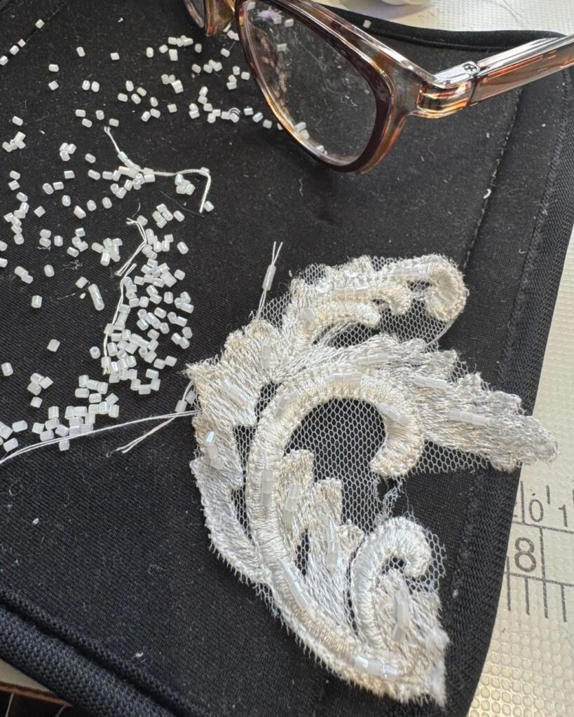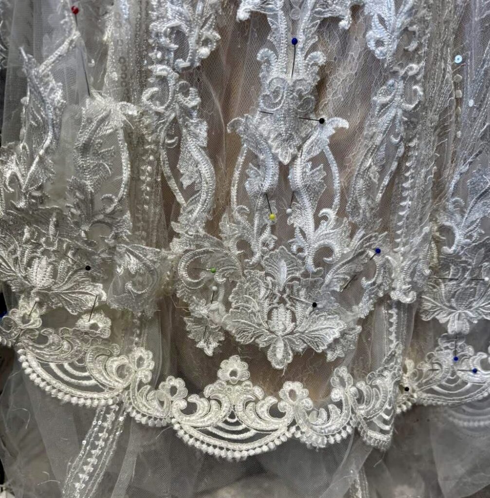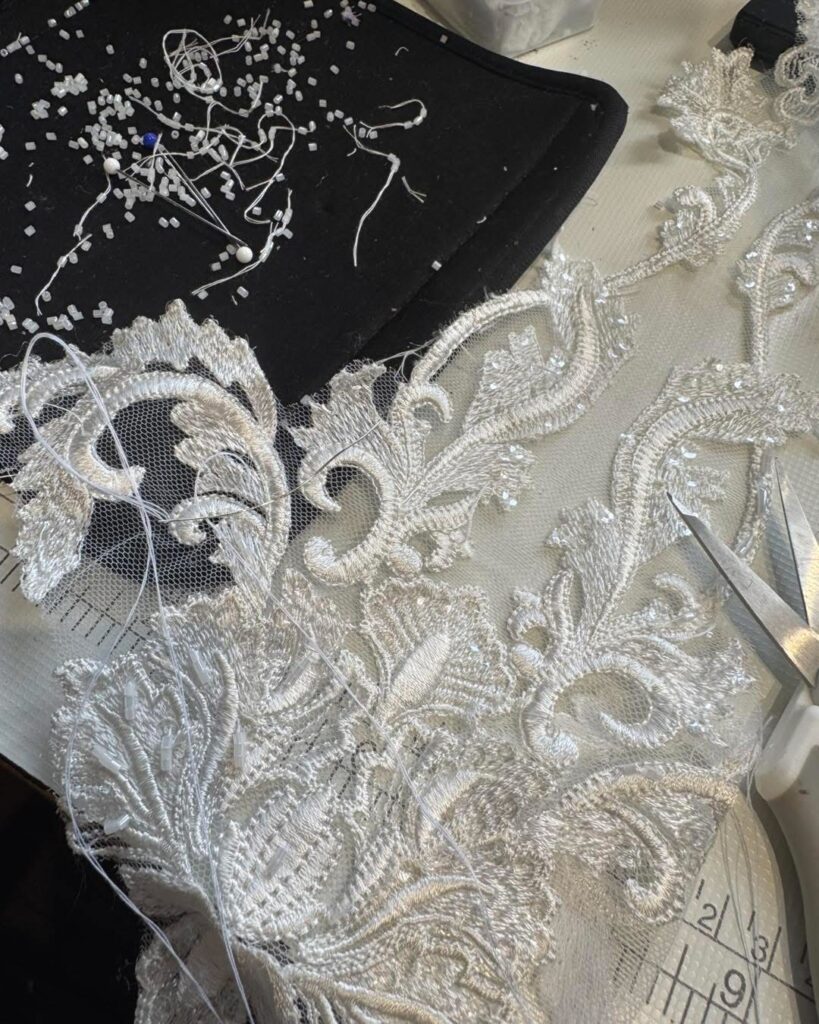 To maintain the beauty of the gown, every element of the lace hem was carefully removed — including the intricate beadwork. Each lace piece was then meticulously re-embroidered by hand before being reapplied to the newly adjusted length.
