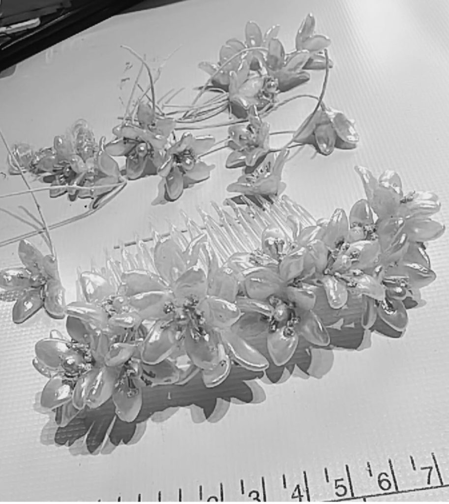 Alongside my hand-painted silk work, I occasionally create bespoke veils and refined bridal details like bespoke hair combs & accessories designed to complement the gown with subtlety and balance.