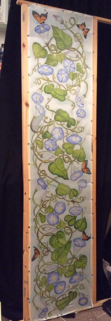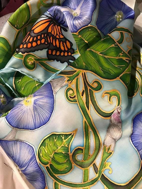 This morning glory silk scarf was created as a commissioned gift — a husband’s request for his wife’s 50th birthday.